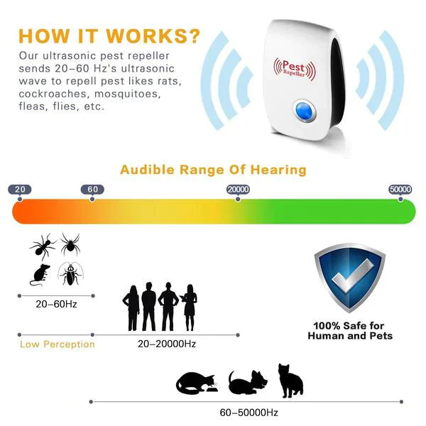 All-In-One Repeller:Â Drives away all roaches, mice, insects, mosquitos, lizards, spiders, fleas, flies, and more. The intolerable sound waves cause them to escape and not return again.Â